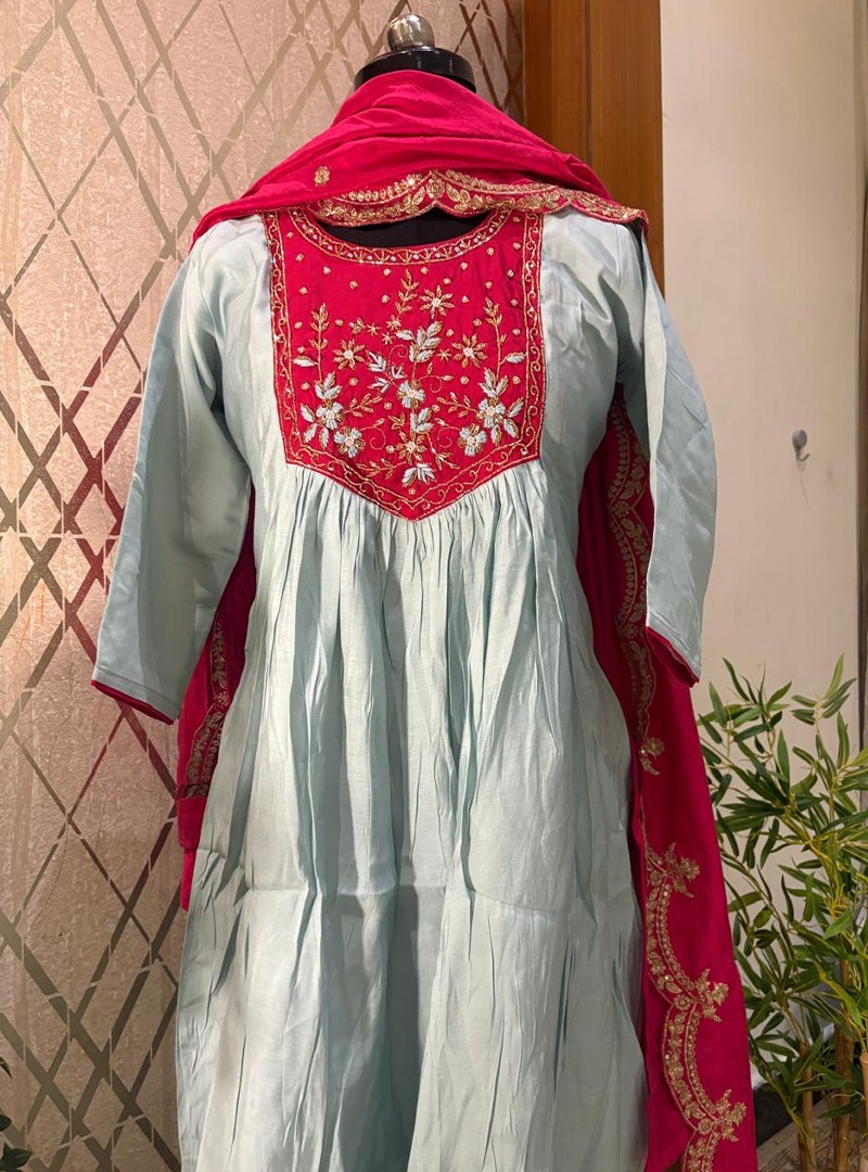 Elegant Mul Chanderi suit set in pastel green with embroidered yoke and rich red dupatta. Available in M to XXL, perfect for festive and traditional wear.