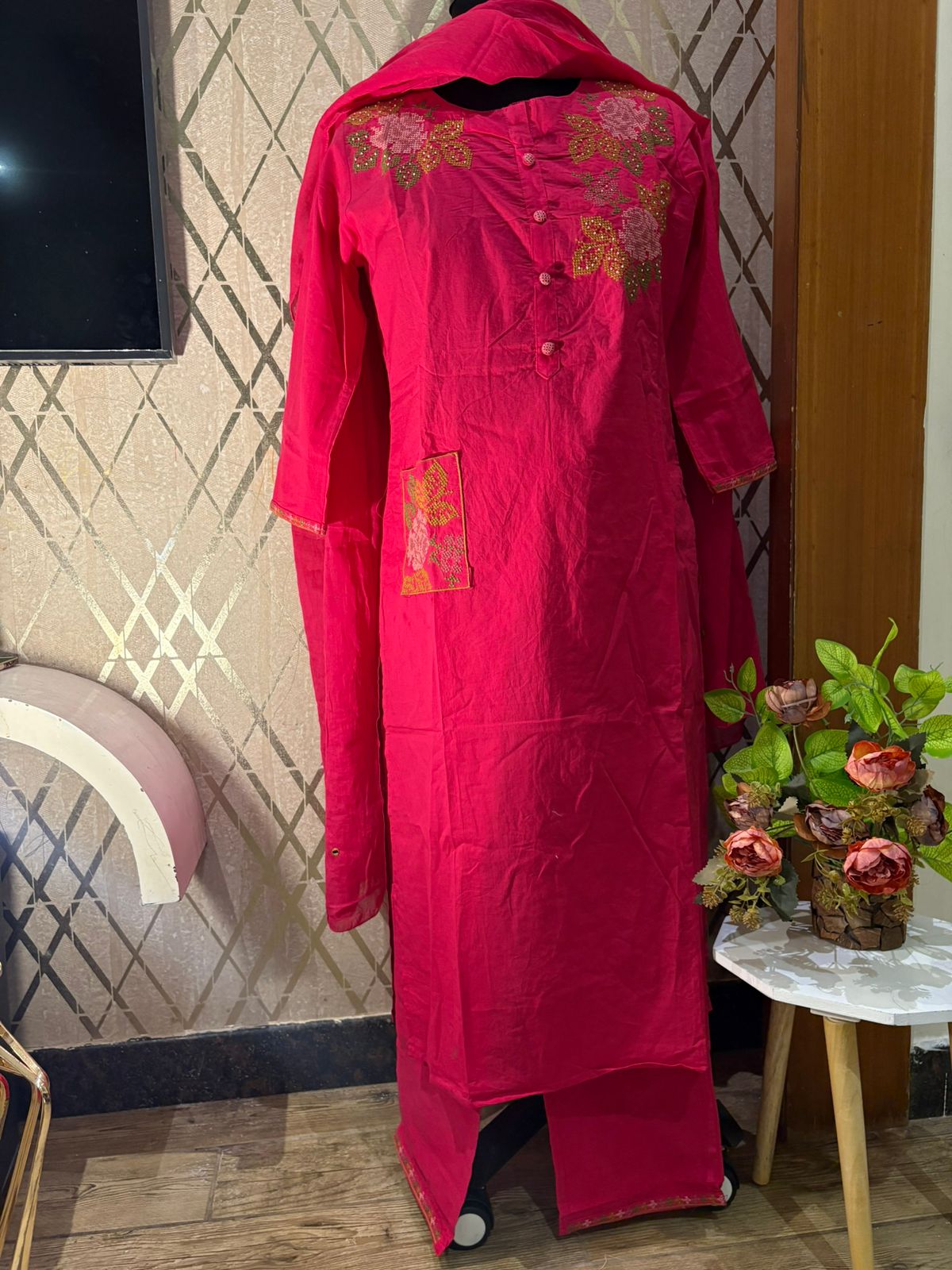 This pink embroidered kurti set is designed for women who love simple yet elegant ethnic wear. The soft fabric gives comfort for daily use, while the floral embroidery on the neckline and pocket adds a stylish touch.