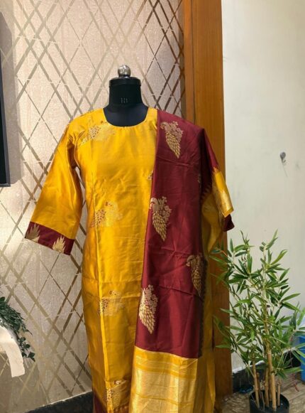 Silk Blend Ethnic Kurti Set for Women – Mustard Yellow with Maroon Dupatta (M to XXL)